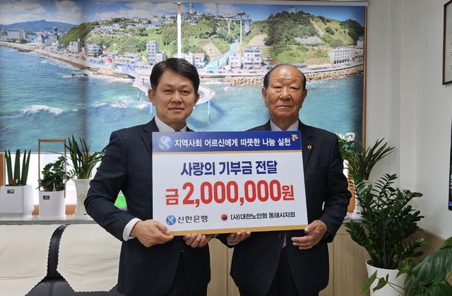 신한은행 동해지점(지점장:원현진)은 지난 22일 (사)대한노인회 동해시지회(지회장:이용기)를 방문, 지역 어르신들의 복지향상과 권익신장을 위해 사랑의 기부금 200만원을 전달했다.