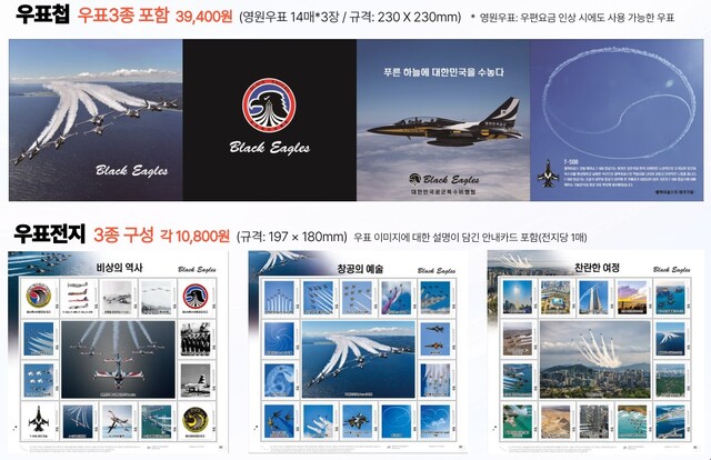 우표전지 3종은 블랙이글스의 역사와 하늘에서의 기동, 주요 에어쇼 장면을 담은 영원우표로 구성됐다. 4면으로 제작된 우표첩은 블랙이글스의 상징적인 비행 장면과 비행 기종인 T-50B를 대형 이미지로 만나 특별한 의미를 더한다.