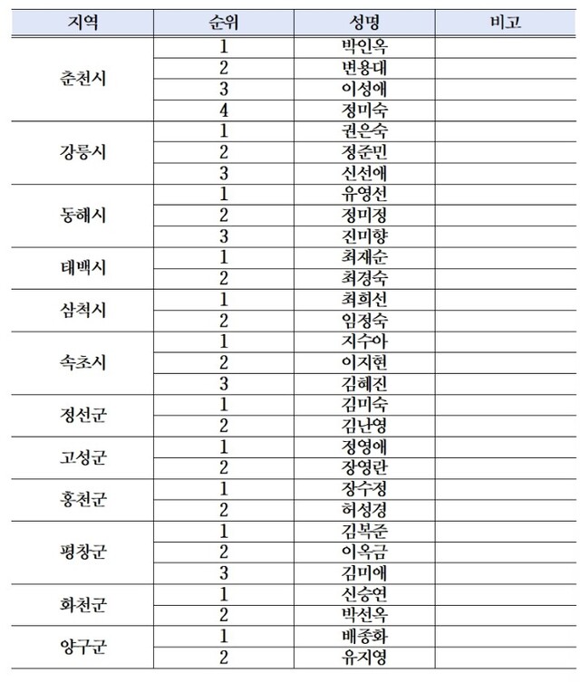 이와 함께 △동해=유영선(1) 정미정(2) 진미향(3) △태백=최재순(1) 최경숙(2) △삼척=최희선(1) 임정숙(2) △속초=지수아(1) 이지현(2) 김혜진(3) △정선=김미숙(1) 김난영(2) △고성=정영애(1) 장영란(2) △홍천=장수정(1) 허성경(2) △평창=김복준(1) 이옥금(2) 김미애(3) △화천=신승연(1) 박선옥(2) △양구=배종화(1) 유지영(2) 후보로 순위가 결정됐다.