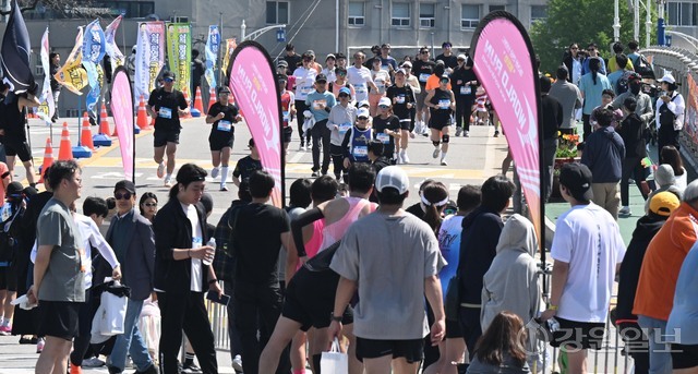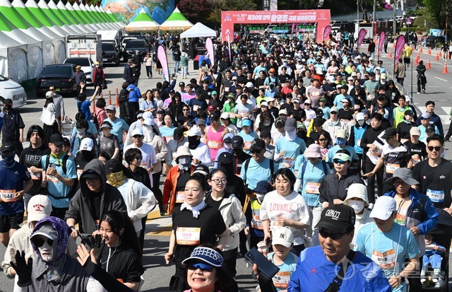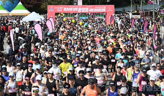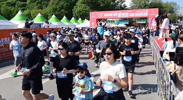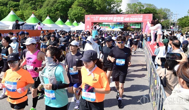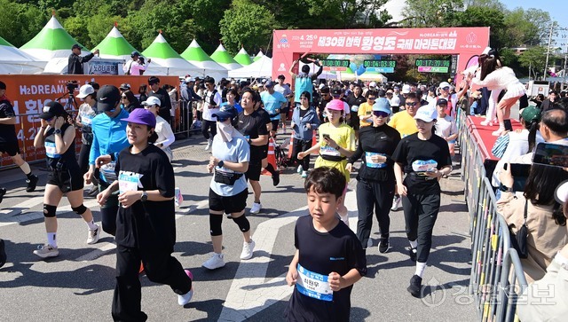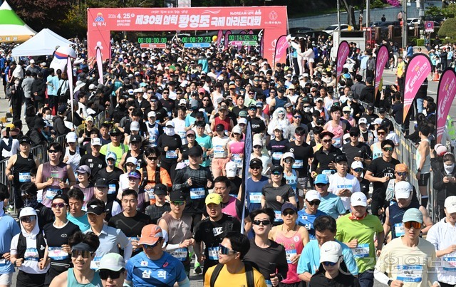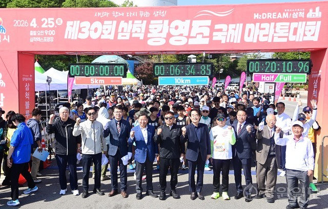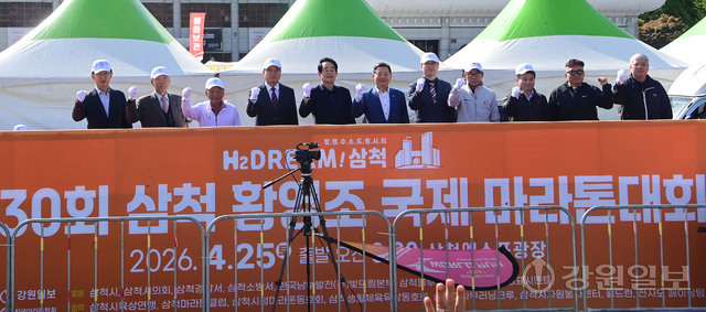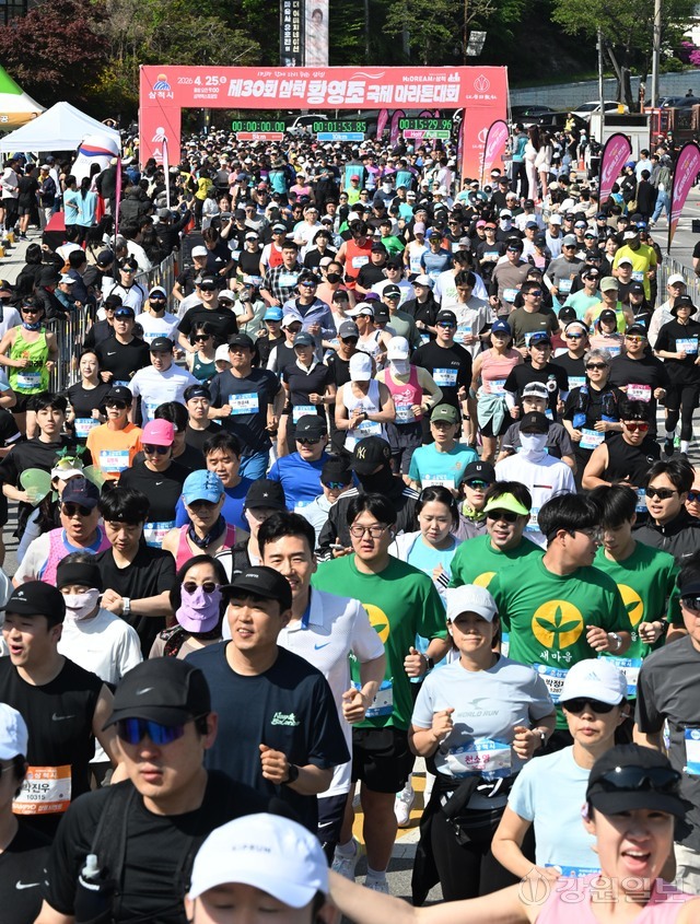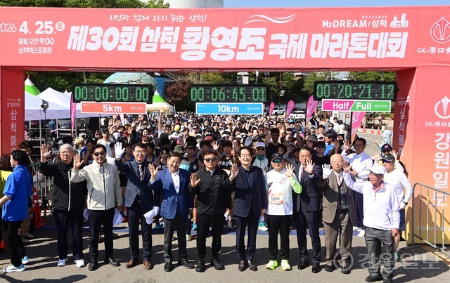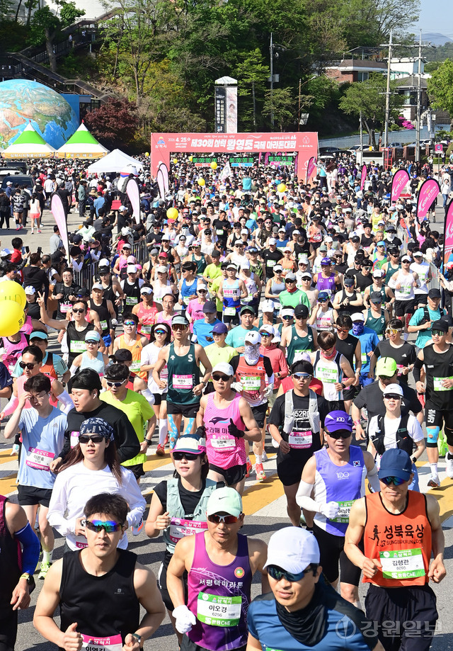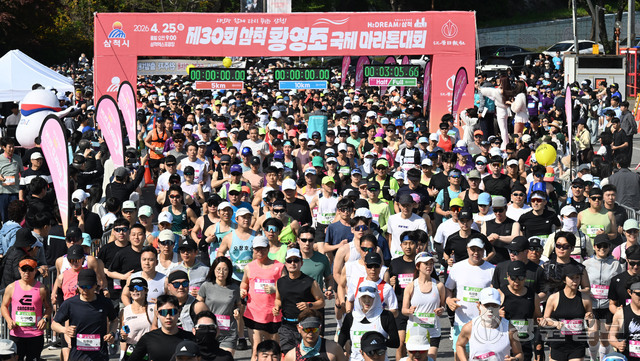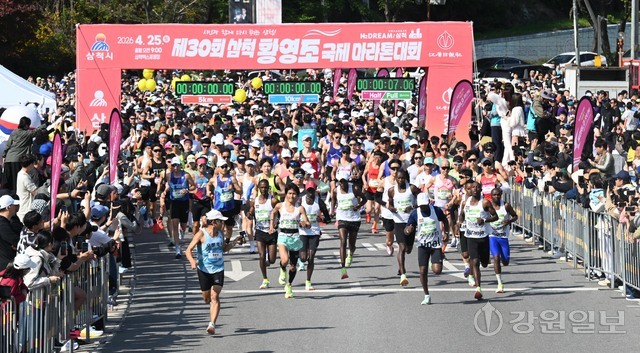 삼척 출신 황영조 선수의 1992년 바르셀로나 올림픽 제패를 기념하는 제30회 삼척 황영조 국제마라톤대회가 25일 삼척 엑스포광장에서 출발, 황영조 고향마을인 근덕면 초곡리를 반환하는 42.195㎞ 공인코스에서 열려 참가자들이 힘찬 출발을 하고 있다.