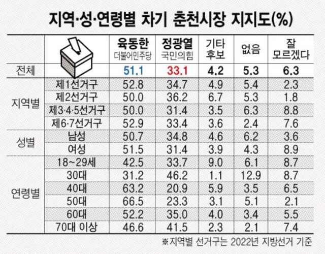 후보 지지도 조사에서 육동한 후보는 40대(63.2%)와 50대(66.5%)·60대(52.2%)의 높은 지지를 얻었다. 정광열 후보의 경우 30대의 지지율이 46.2%로 가장 높았다. 두 후보 모두 70대 이상 지지율은 40%대로 오차 범위내 접전 양상을 보였다.