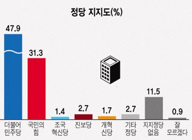 정당 지지도 조사에서는 더불어민주당이 47.9%를 얻으며 31.3%를 확보한 국민의힘을 오차범위 밖 격차로 앞섰다. 또 진보당(2.7%), 개혁신당(1.7%), 조국혁신당(1.4%) 등이 뒤를 이었다. ‘지지 정당 없다’와 ‘잘 모르겠다’에 대한 응답률은 각각 11.5%, 0.9%다.