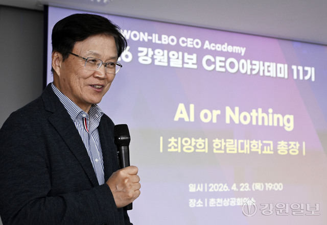 최양희(사진) 한림대 총장이 강원일보 CEO아카데미 11기 4회차 강연에서 AI 문명의 대전환을 소개하며 강원특별자치도 또한 디지털 혁신에 속도낼 시기라고 강조했다.
