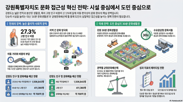 하지만 강원의 문화정책 과제는 단순한 사업비 확대에 머물러서는 안된다. 행정안전부 주민등록 인구통계에 따르면 2026년 3월 기준 강원특별자치도 주민등록인구는 150만6,843명, 65세 이상 인구는 41만1,360명으로 고령 인구 비중이 약 27.3%다. 고령층과 청소년, 장애인, 농산어촌 주민에게 문화시설까지의 이동거리와 교통비는 실질적인 문화 접근 장벽이 된다.