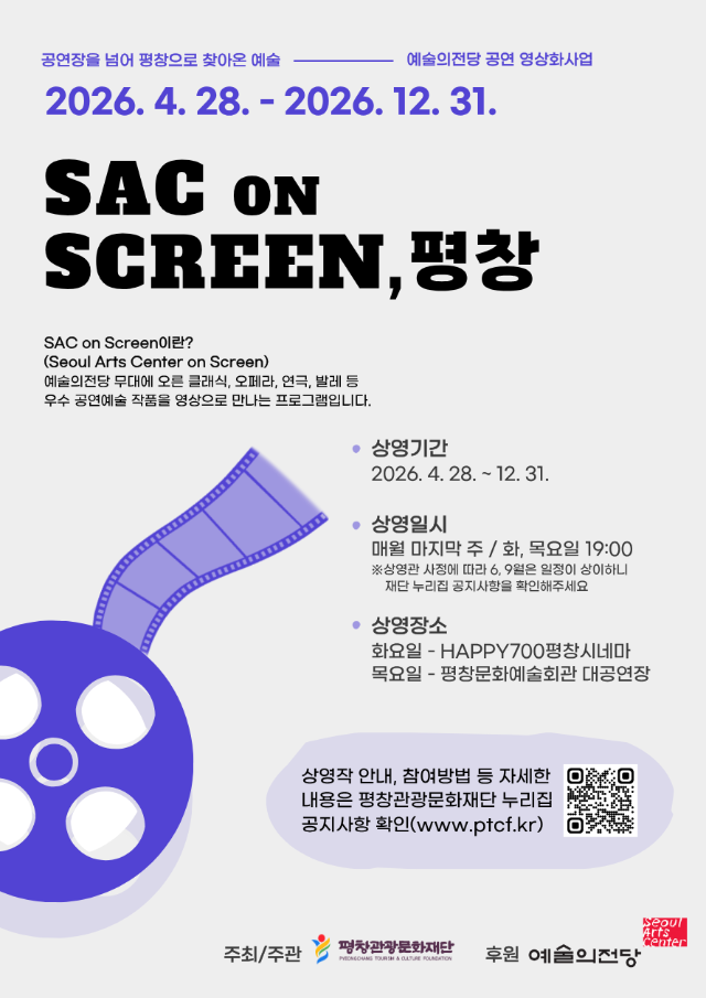 【평창】(재)평창관광문화재단은 군민의 문화 향유 기회 확대 및 관내 공연예술 콘텐츠 다변화를 위해 예술의전당 공연영상 콘텐츠를 상영하는 ‘SAC on Screen 평창’ 프로그램을 운영한다고 27일 밝혔다.