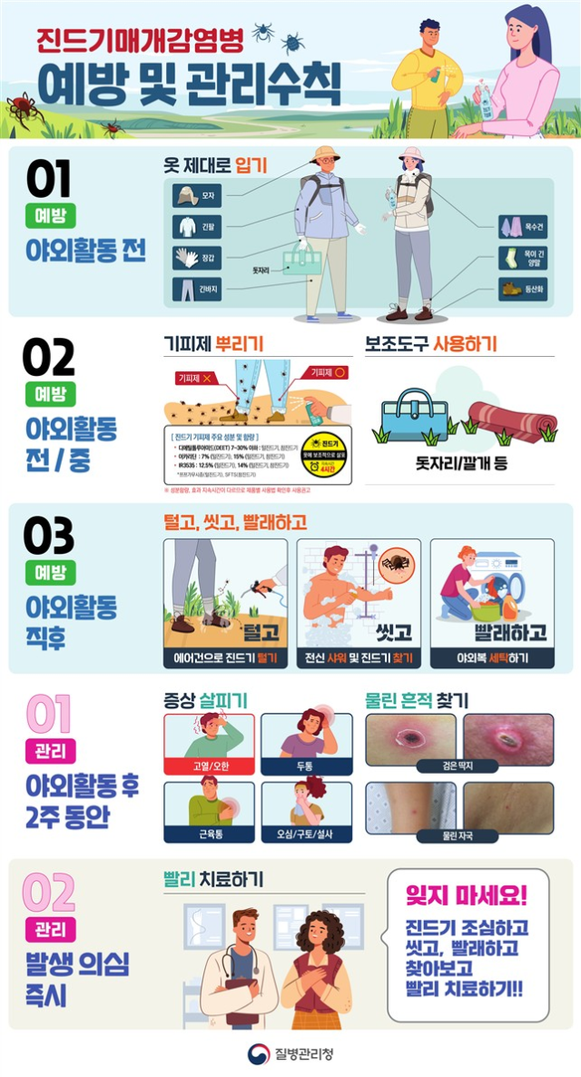 시보건소 관계자는 “야외활동 시 진드기에게 물리지 않도록 예방수칙을 철저히 준수해야 한다”라며, “진드기에 물린 후 2주 이내에 38도 이상의 발열이나 소화기 증상이 나타나면 즉시 의료기관을 방문해 진료를 받아야 한다”라고 강조했다.