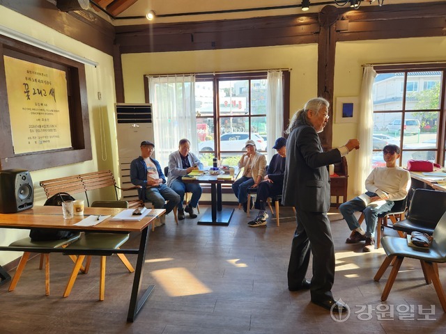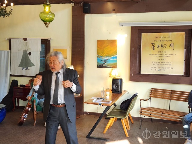 음악평론가 김진묵씨가 지난 26일 춘천 파피루스에서 신간 ‘꽃 그리고 새’ 출판기념회를 열였다.