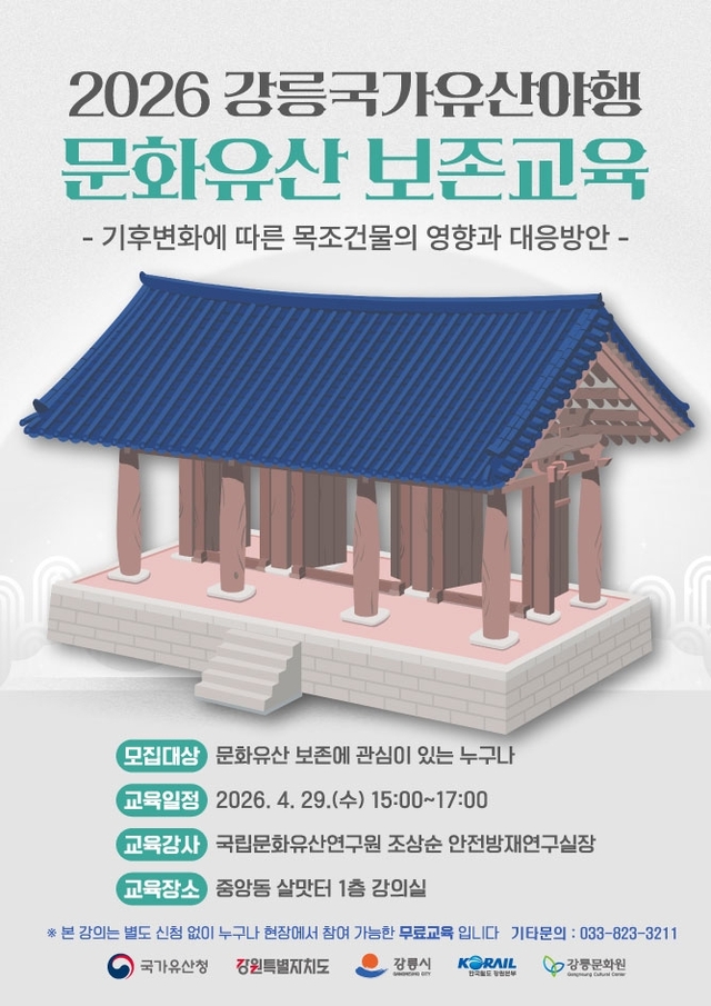 【강릉】강릉문화원은 29일 오후 3시 살맛터 1층 강의실에서 2026 강릉국가유산야행 문화유산 보존교육을 진행한다.