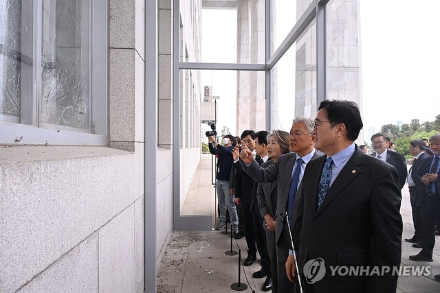 문 전 대통령은 기념식에 앞서 우 의장과 함께 12·3 비상계엄 당시 계엄군이 본청에 진입하며 깨뜨린 유리창 등을 둘러봤다.