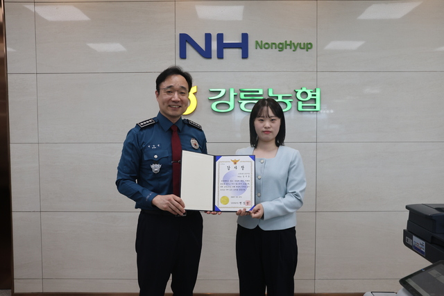 강릉경찰서(서장:변상범)은 27일 강릉농협 남강지점을 찾아 보이스피싱 피해를 예방한 은행원에게 감사장을 전달했다. 해당 은행원은 고객이 보이스피싱 피해가 의심되자 즉시 신고, 경찰관과 함께 피해자의 휴대폰에 악성앱 설치, 5,000만원 대출 사실을 확인하고 즉시 지급정지해 피해를 예방했다.