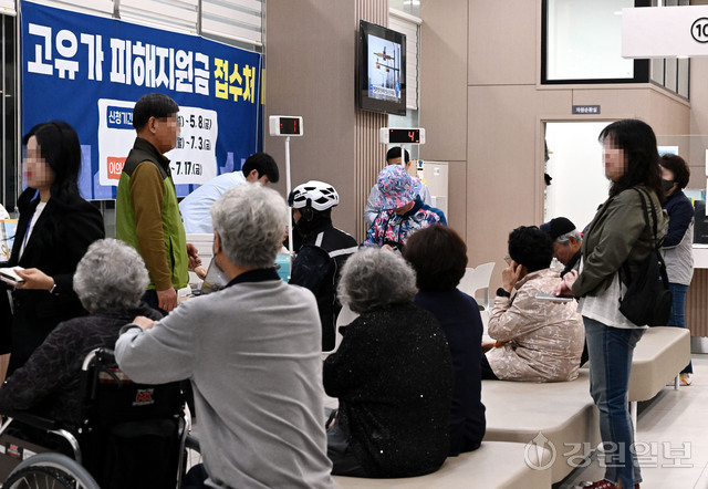 고유가 피해지원금 1차 지급 첫날인 27일 춘천시 강남동행정복지센터에서 시민들이 지원금을 신청하기 위해 대기하고 있다.