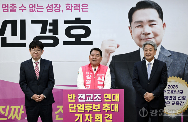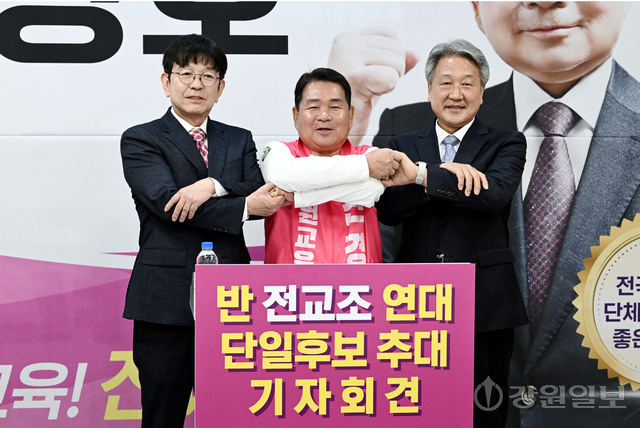 조백송 전 강원교총 회장과 김익중 전 도교육청 진로교육원장은 27일 강원특별자치도교육청 브리핑룸에서 ‘반 전교조연대’ 단일후보 추대 기자회견을 열고 신경호 도교육감 예비후보를 단일후보로 공식 추대하고 지지를 선언했다.