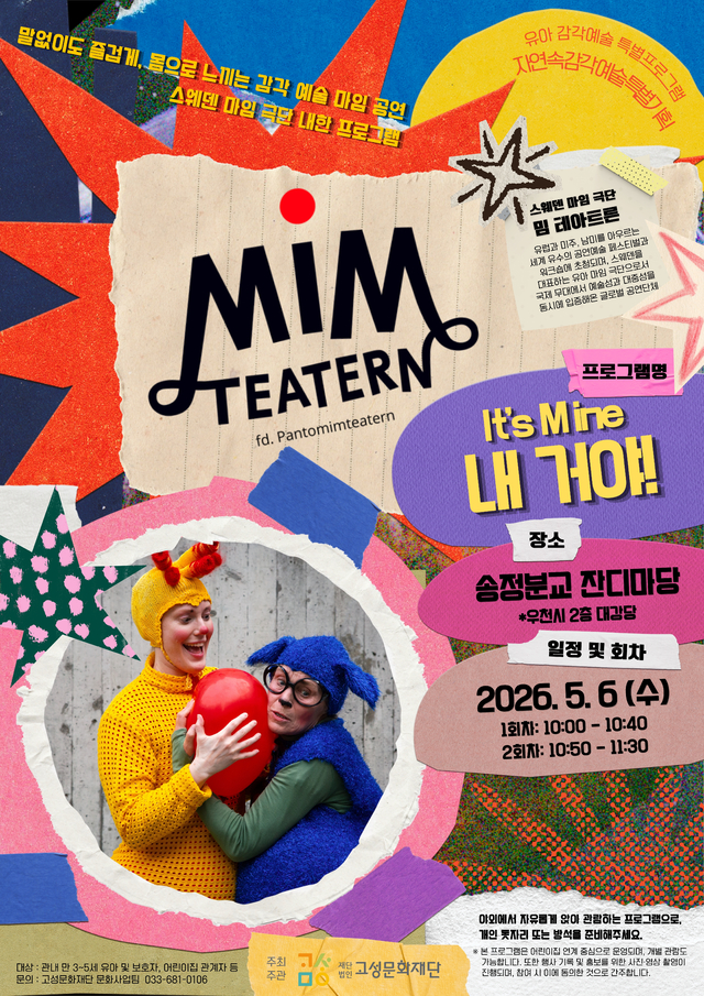 ‘내 거야! It’s Mine!’은 2인 배우가 출연하는 약 35분 분량의 어린이 마임 공연으로, 공감과 협동, 감정 이해를 몸짓과 놀이를 통해 풀어내는 작품이다. 자연 속 야외 공간에서 자유롭게 관람하는 방식으로 진행돼, 유아들이 보다 편안한 분위기 속에서 예술을 경험할 수 있도록 구성했다.