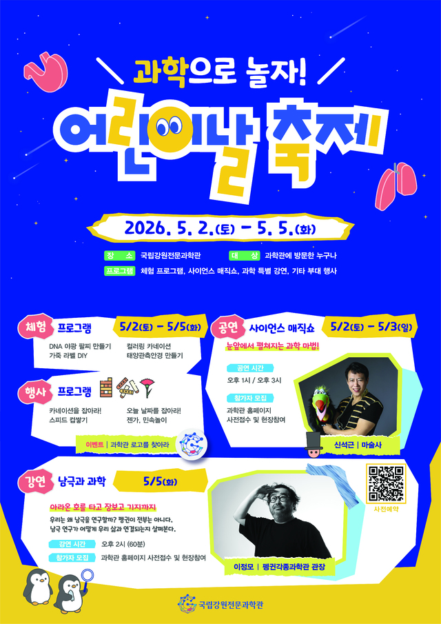 DNA 야광 팔찌, 컬러링 카네이션, 태양 관측 안경 만들기와 가죽라벨 DIY 등 체험 프로그램과 실내놀이터 및 반응속도 이벤트, 과학관 로고 찾기 미션 등 다양한 이벤트가 준비됐다. 특별 프로그램으로는 2, 3일 오후 1시와 3시 과학마술쇼가 진행되고 5일 오후 2시에는 과학커 뮤니케이터 이정모 관장 초청 특별 강연이 열린다. 이 관장은 '남극과 과학’을 주제로 어린이의 눈높이에 맞춰 극지 연구와 과학 이야기를 쉽고 흥미롭게 풀어낼 예정이다. 사전 참가 접수 학생에게는 저자 사인이 담긴 도서를 선착순 배부한다. 김설영기자 snow0@kwnews.co.kr