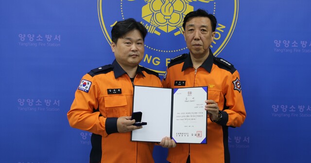 양양소방서(서장:강복식)는 지난 28일 소회의실에서 신속한 응급처치로 심정지 환자를 소생시킨 김두회 소방위에게 ‘하트세이버(Heart Saver)’ 인증서를 수여했다. 하트세이버는 심정지 환자의 생명을 구한 대원에게 수여한다.