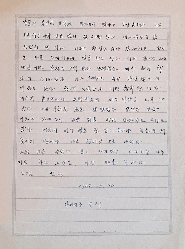 이번 전시는 ‘가족애’, ‘안부’, ‘기다림’을 키워드로, 한 시대를 관통한 아날로그적 소통의 감성을 회화와 글로 풀어낸 자리다. 전시 중심에는 1960~80년대 실제 한 가족이 주고받은 편지가 놓여 있다. 작가는 손글씨로 마음을 눌러 담아 전하던 시절의 기억을 되짚는다.