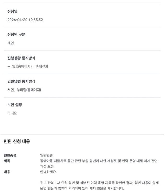 강릉에 거주하는 40대 A씨는 뇌병변장애를 가진 5세 자녀를 양육하고 있다. 5살 여아는 독립보행이 어려워 지속적인 재활치료가 필요하지만 치료사가 지난달 퇴사한 뒤 대체 인력이 확보되지 않아 한 달째 치료를 받지 못하고 있다. A씨는 지난 10일부터 재활치료 인력 확충과 치료 공백 최소화, 사설 치료 의존 완화, 경제적 부담 경감을 위한 제도 개선 등을 요구하고 있다.
