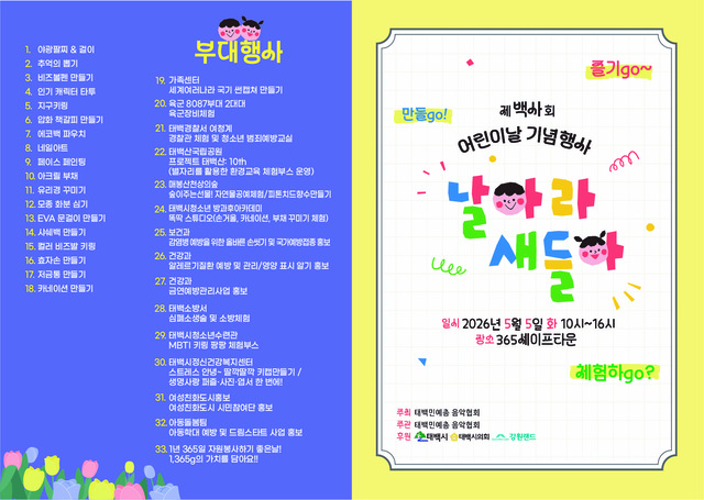 【태백】태백시 제104회 어린이날 기념행사 ‘날아라 새들아 페스티벌’이 다음달 5일 365세이프타운에서 열린다.