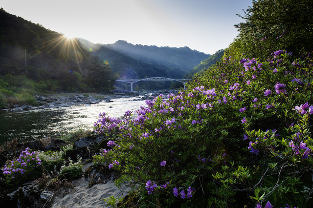 래프팅 명소로 알려진 인제군 내린천 일대에 철쭉이 만개해 장관을 이루고 있다. 내린천변 트레킹코스가 연분홍 띠를 두른 듯 핑크빛으로 물들었다.