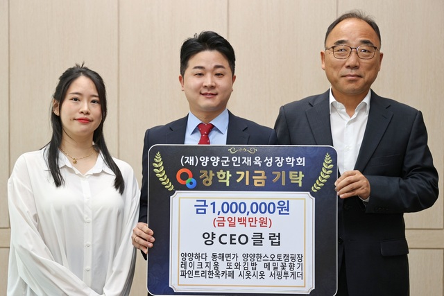 양CEO클럽(회장:김성재)은 29일 양양군청을 방문해 탁동수 양양군수권한대행에게 인재육성장학기금 100만원을 전달했다.