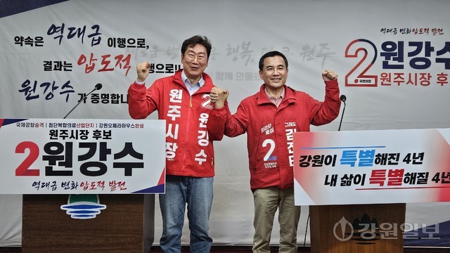 두 후보는 29일 원주시청 브리핑룸에서 합동 기자회견을 열고 “원주의 중단없는 발전과 ‘압도적 도약’ 완성을 위해 하나가 될 것”이라며 “원주를 중부권 메기시티로 확실히 자리매김할 수 있도록 협력하겠다”고 한목소리를 냈다.