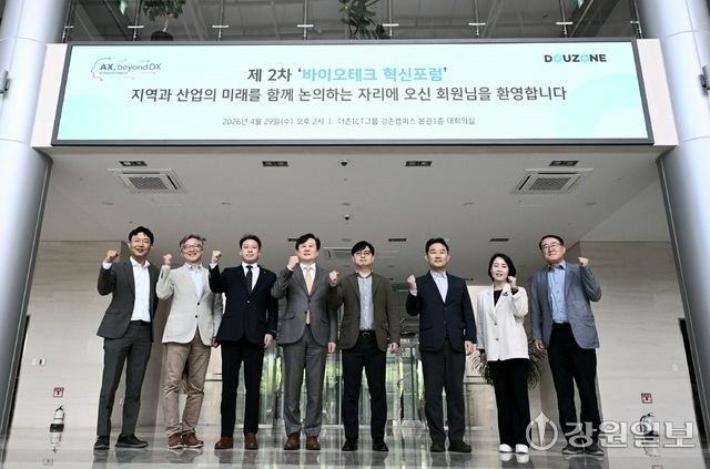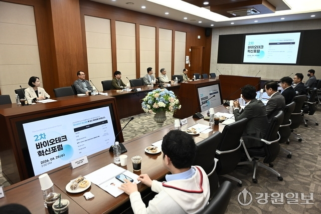 2차 바이오테크 혁신포럼이 29일 더존ICT그룹 강촌캠퍼스에서 춘천 기업혁신파크 시행사 바이오테크이노밸리(주) 김용찬 대표이사, 안용호 프로티움 사이언스 대표, 김석만 강원일보 미래사업본부장을 비롯한 내빈과 전문가들이 참석한 가운데 열렸다.