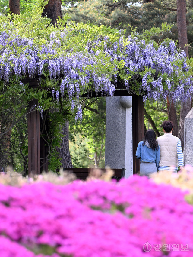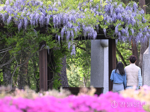 화창한 날씨를 보인 29일 강릉시 초당동의 허균난설헌기념공원에서 관광객들이 활짝 핀 보랏빛 등나무꽃 아래에서 거닐고 있다.