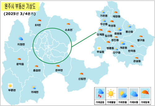 【원주】원주지역 부동산 시장이 지지부진한 흐름을 이어가고 있다. 원주시가 최근 공개한 부동산 기상도에 따르면 올 3·4분기 부동산 거래량은 4,356건으로 3년간 분기 평균 거래량(4,907건) 대비 11.23% 낮았다. 2·4분기(4,594건)와 비교해서도 238건(5.18%) 줄어든 것으로 나타났다. 거래 동향은 '보통'으로 분류됐지만 시는 최근 3년간 부동산 거래량이 하락하는 추세라고 분석했다. 25곳 읍면동별 거래 동향에서 거래 활발은 무실동과 부론면 등 2곳에 그쳤다. 거래 원활은 7곳, 보통은 1곳, 침체는 15곳이다. 거주지별로는 관할시도 내 거주자 거래가 3,365건으로 관할시도 외 991건 대비 세배이상 많았다. 특히 관할시도 외 거래는 2·4분기 1,674건에서 급감했다. 다만 2023년 2,175세대로 고점을 찍었던 아파트 미분양 물량은 지속적으로 줄고 있다. 국토교통부 미분양 주택 현황 보고에 따르면 원주 아파트 미분양은 올 9월 기준 483세대로 전달 506세대 대비 23세대 감소했다. 하지만 이 역시 부동산 경기 회복보다는 실거주자들에 의한 적체물량 해소로 봐야 한다는 게 업계의 설명이다. 김원래 한국공인중개사협회 원주시지회장은 "4,500만원까지 마이너스피가 붙는 등 저가 매물이 많아 미분양 아파트가 거래된다 뿐이지 부동산 시장은 정체된 상황"이라며 "일반 경기는 뒤따라가는 만큼 부동산 경기가 내년 상반기에는 다소 나아질 것으로 전망한다"고 했다.