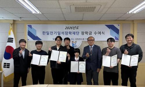 한국폴리텍대학 원주캠퍼스(학장:권민수)는 최근 대학에서 한일전기일석장학재단 장학금 수여식을 열어 학생 5명에게 총 1,500만원의 장학금을 전달했다. 김설영기자 snow0@kwnews.co.kr