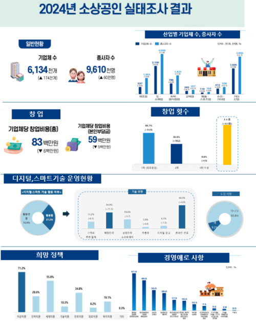 강원지역 소상공인 기업체와 종사자 모두 소폭 증가했다. 중소벤처기업부와 소상공인시장진흥공단은 최근 '2024년 소상공인실태조사' 결과를 발표했다.조사 결과에 따르면 2024년 기준 도내 소상공인 기업체 수는 19만개로 전년대비 2.6% 증가했으며, 종사자는 5.3% 늘어난 31만6,000명으로 집계됐다. 창업 동기로는 '자신만의 사업을 직접 경영하고 싶어서'(65.7%)가 가장 많았다. '수입이 더 많을 것 같아서'(18.1%), '임금근로자로 취업이 어려워서'(15.8%) 창업에 나섰다는 이들도 있었다. 소상공인이 체감하는 경영 애로사항(복수응답)으로는 경쟁 심화(61.0%)가 가장 많이 꼽혔다. 다음으로는 원재료비(49.6%), 상권 쇠퇴(33.5%), 보증금·월세(28.6%), 최저임금(17.5%) 등의 순으로 나타났다.