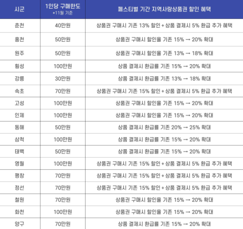 ...·고성·인제·삼척·영월·화천 등이 100만원으로 가장 높다. 할인 방식은 상품권 구매 시 선할인을 적용하거나, 결제 후 환급(캐시백)을 제공하는 형태다. 다만 양양군은 지역사랑상품권을 내년부터 발행해 이번 행사에는 참여하지 않는다. 강원자치도 관계자는...