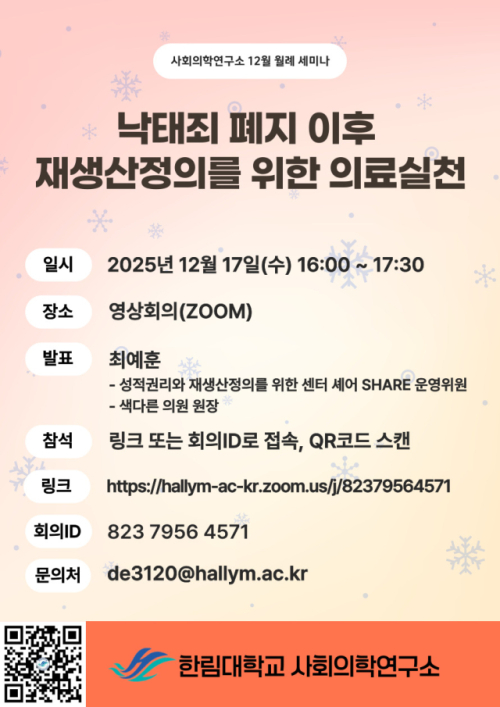 한림대학교 사회의학연구소는 오는 17일 낙태죄 폐지 이후 재생산정의를 위한 의료실천을 주제로 12월 월례 세미나를 개최한다. 세미나는 비대면 ZOOM인 영상회의로 진행될 예정이다. 이날 영상회에서 최예훈 색다른 의원 원장이 발표자로 나선다. 참석자들은 링크 또는 회의 ID로 접속해 QR코드를 스캔해 참석 가능하다. 자세한 내용은 한림대 사회의학연구소 홈페이지(링크: https://hallym-ac-kr.zoom.us/j/82379564571)를 참고하면 된다.