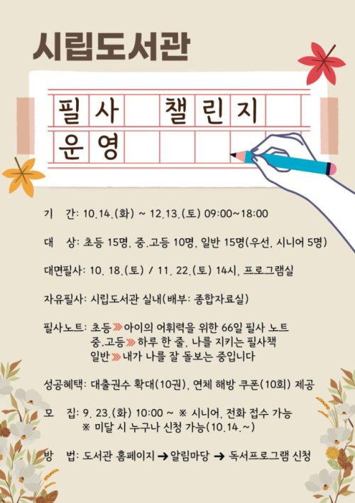 【태백】태백시립도서관은 다음달 14일부터 12월 13일까지 '필사 챌린지'를 운영한다. 참여 대상은 초등학생 15명, 중·고등학생 10명, 일반·시니어 15명 등이다. 도서관에서 제공하는 필사 노트를 활용해 기간 내 필사를 완료하면 도서 대출 권수를 10권으로 확대하고 연체 해방 쿠폰 10회권을 제공할 예정이다. 참가하는 초등학생은 '아이의 어휘력을 위한 66일 필사 노트', 중·고등학생은 '하루 한 줄, 나를 지키는 필사책', 일반·시니어는 '내가 나를 잘