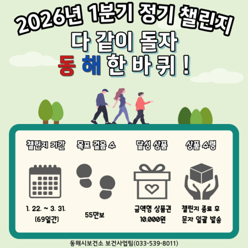 ...의 걷기 실천 참여를 높인다. 챌린지 참여를 원하는 시민은 스마트폰 ‘워크온 앱을 설치한 후 ‘걷고 싶은 도시 동해시’ 공식 커뮤니티에 가입하고, 커뮤니티 내 해당 분기 챌린지를 선택해 참여하면 된다. ‘워크온’ 걷기 사업은 2020년부터 시행해 오고...