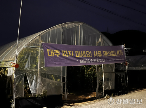 ...마 피해에 이어 농작물 절도까지 겹치며 농민들의 시름이 깊어지고 있다. 2일 춘천시 신동면 실래마을 금병산 등산로 입구. 비닐하우스 앞에는 ‘대추 따가지 마세요! 사유재산입니다. 경찰에 신고합니다’라는 문구의 현수막이 걸려 있었다. 10년째 대추농사를...
