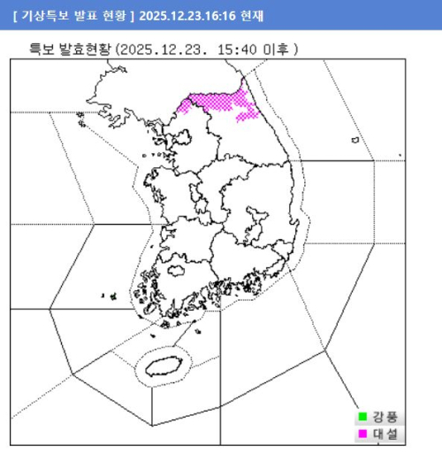 강원북부산지와 양구평지에 대설주의보가 내려졌다. 기상청은 23일 오후 3시40분께 강원북부산지와 양구평지에 대설주의보를 발효하고 눈길, 빙판길 운전에 주의를 당부했다. 23일 오후 1시부터 오후 3시 기준 주요지점 최심신적설 현황은 광덕산(화천) 5.0㎝, 철원(양지) 3.2㎝, 오천터널(양구) 0.4㎝, 화천 0.1㎝ 등이다. 이번 눈과 비는 크리스마스 이브날인 24일 오전까지 내리겠다. 예상 적설량은 강원중·북부산지, 강원북부내륙 1~5㎝, 강원중부내륙, 강원남부산지(해발고도 1,000m 이상) 1~3㎝다. 강원지방기상청 관계자는 “많은 눈으로 인한 교통안전과 보행자 안전에 각별히 유의해야 한다”고 말했다.