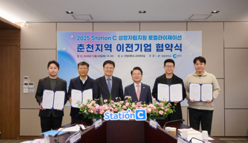 한림대는 지난달 30일 대학본부 2층 교무회의실에서 글로컬대학30 사업 '2025 Station C 춘천지역 이전기업(로컬라이제이션)' 사업을 통해 춘천으로 본사를 이전할 4개 기업과 협약식을 열었다. 이날 행사에는 최양희 한림대 총장과 육동한 춘천시장이 참석해 협약 체결을 축하하고 이전기업의 지역 안착을